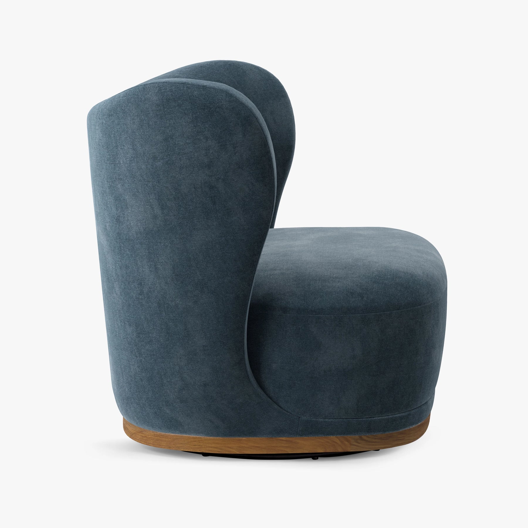 The Odell swivel chair is a modern take on the classic wingback silhouette, with a molded back frame offering a cozy, enveloping feel. The swivel base is hidden beneath a solid wood plinth, finished in walnut.